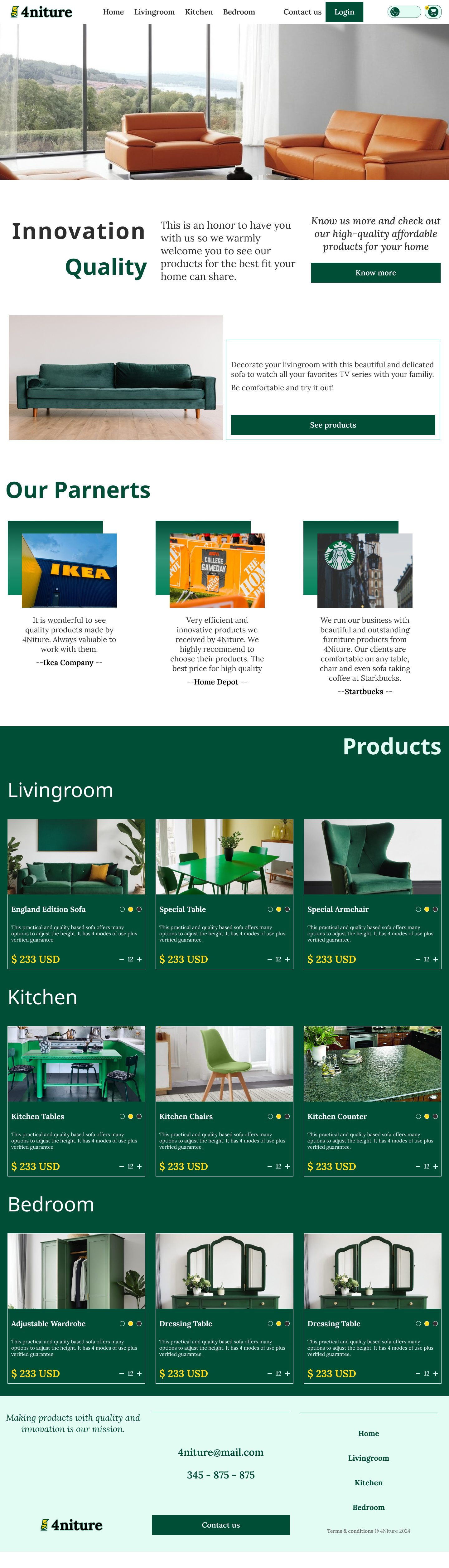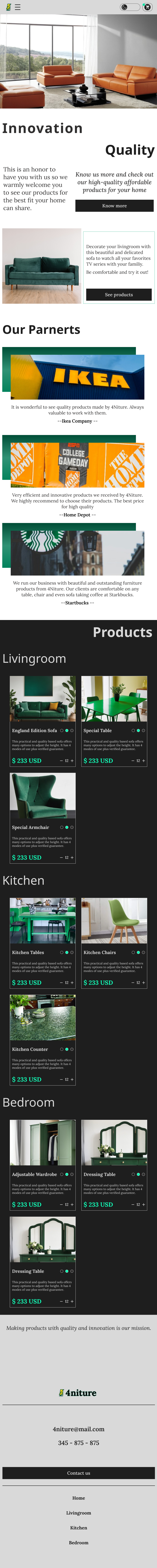 Design a one page model website for selling home products like furnitures ensuring responsiveness and dark mode functionality.